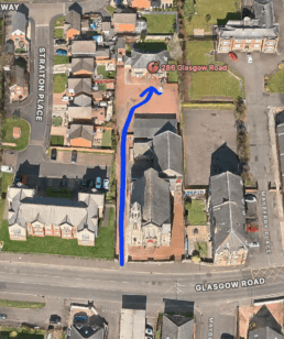 When you arrive, your Satnav(GPS) will lead you to Livingston Memorial Church it’s the church with the bell tower right on Glasgow Road.